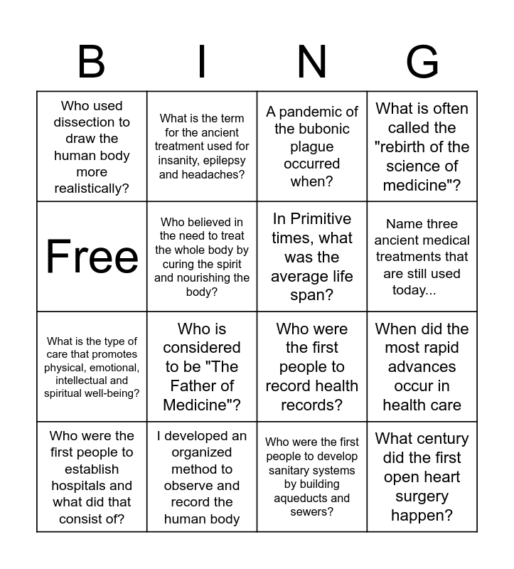 This bingo card has 16 words: I developed an organized method to observe and record the human body, When did the most rapid advances occur in health care, A pandemic of the bubonic plague occurred when?, Who used dissection to draw the human body more realistically?, What is the type of care that promotes physical, emotional, intellectual and spiritual well-being?, What is the term for the ancient treatment used for insanity, epilepsy and headaches?, Who were the first people to record health records?, Who were the first people to develop sanitary systems by building aqueducts and sewers?, Free, Who believed in the need to treat the whole body by curing the spirit and nourishing the body?, Who were the first people to establish hospitals and what did that consist of?, What is often called the "rebirth of the science of medicine"?, Who is considered to be "The Father of Medicine"?, Name three ancient medical treatments that are still used today..., In Primitive times, what was the average life span? and What century did the first open heart surgery happen?.