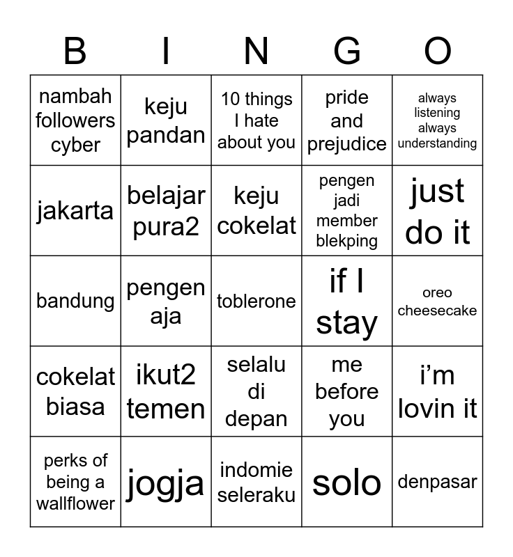 This bingo card has a free space and 24 words: ikut2 temen, jogja, keju cokelat, perks of being a wallflower, always listening always understanding, nambah followers cyber, jakarta, keju pandan, if I stay, selalu di depan, pengen jadi member blekping, bandung, me before you, iβm lovin it, belajar pura2, solo, oreo cheesecake, 10 things I hate about you, just do it, pengen aja, denpasar, cokelat biasa, pride and prejudice and indomie seleraku.