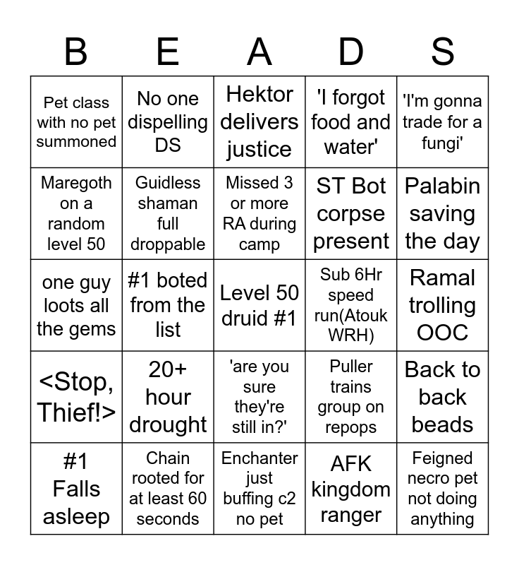 This bingo card has a free space and 24 words: 20+ hour drought, Chain rooted for at least 60 seconds, Missed 3 or more RA during camp, #1 Falls asleep, 'I'm gonna trade for a fungi', Pet class with no pet summoned, Maregoth on a random level 50, No one dispelling DS, Sub 6Hr speed run(Atouk WRH), 'are you sure they're still in?', ST Bot corpse present, one guy loots all the gems, Puller trains group on repops, Back to back beads, Guidless shaman full droppable, AFK kingdom ranger, Ramal trolling OOC, Hektor delivers justice, Palabin saving the day, #1 boted from the list, Feigned necro pet not doing anything, <Stop, Thief!>, 'I forgot food and water' and Enchanter just buffing c2 no pet.