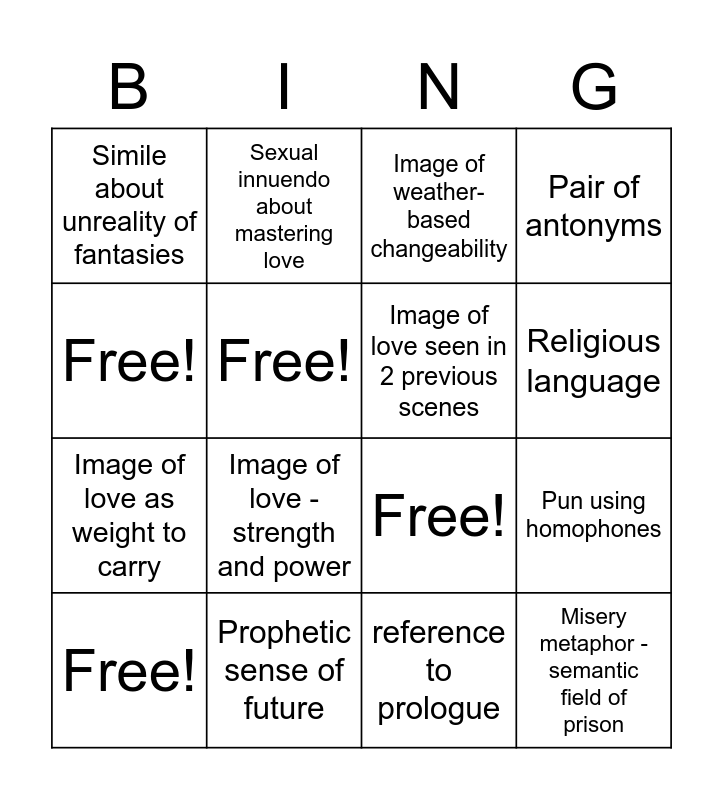 This bingo card has 16 words: Prophetic sense of future, Pun using homophones, Image of weather-based changeability, Simile about unreality of fantasies, Image of love as weight to carry, Sexual innuendo about mastering love, Free!, reference to prologue, Free!, Free!, Free!, Pair of antonyms, Image of love - strength and power, Religious language, Image of love seen in 2 previous scenes and Misery metaphor - semantic field of prison.