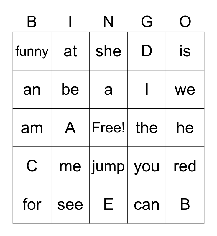 This bingo card has a free space and 24 words: me, see, a, for, is, funny, an, at, the, jump, I, am, you, red, be, can, he, she, we, A, B, C, D and E.