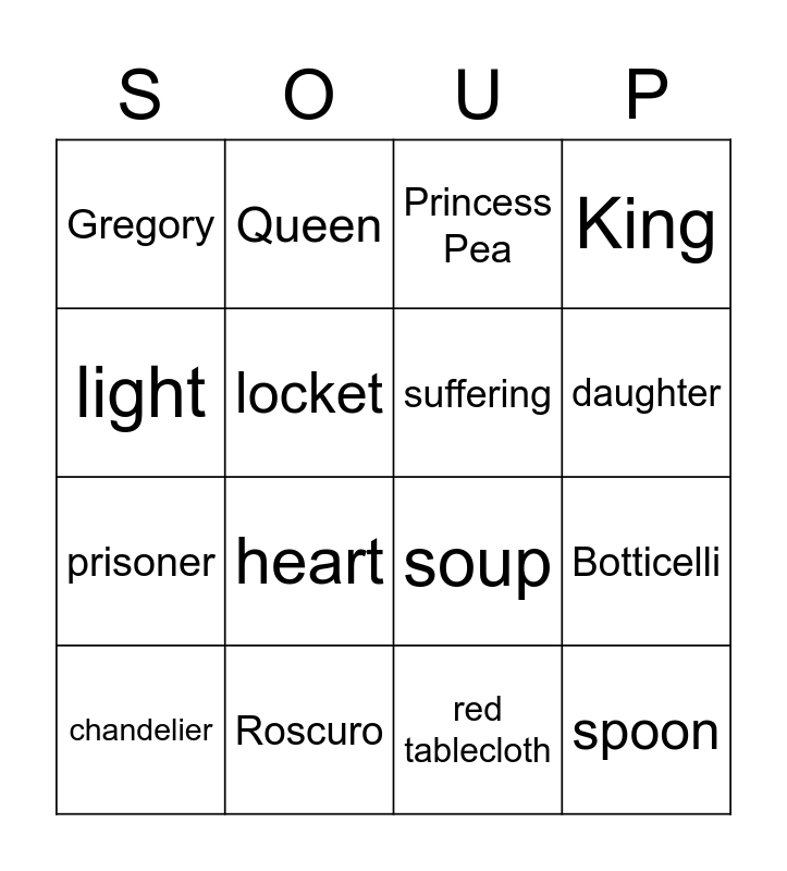 This bingo card has 16 words: Roscuro, Botticelli, Princess Pea, Gregory, prisoner, Queen, soup, red tablecloth, light, locket, chandelier, King, heart, daughter, suffering and spoon.