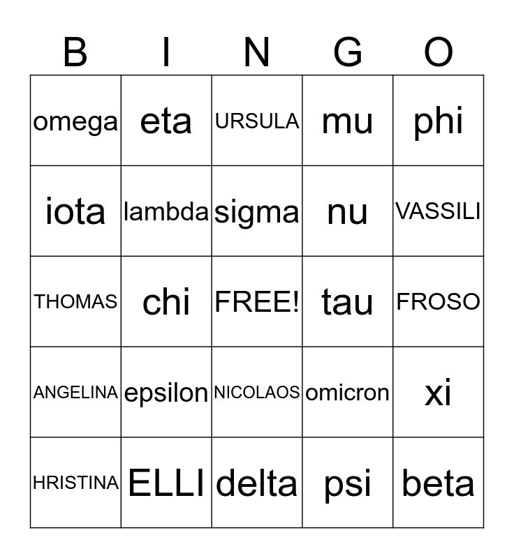 This bingo card has a free space and 48 words: alpha, beta, gamma, delta, epsilon, zeta, eta, theta, iota, kappa, lambda, mu, xi, omicron, pi, rho, sigma, tau, upsilon, phi, chi, psi, omega, nu, MAVRA, VASSILI, HRISTINA, ELENI, NICOLAOS, ANGELINA, GORGIOS, GIANNIS, AMALIA, AFRODITI, ELLI, THIMITRIOS, FOTO, FROSO, MARY, DESPINA, EFTHIMIOS, SOFIA, URSULA, SPIROS, THOMAS, RAPHAEL, YANNA and KOSTADINOS.