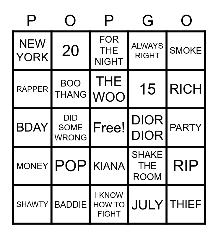 This bingo card has a free space and 24 words: POP, BADDIE, THE WOO, SHAWTY, SMOKE, NEW YORK, RAPPER, 20, DIOR DIOR, KIANA, 15, BDAY, SHAKE THE ROOM, RIP, BOO THANG, JULY, PARTY, FOR THE NIGHT, RICH, DID SOME WRONG, THIEF, MONEY, ALWAYS RIGHT and I KNOW HOW TO FIGHT.