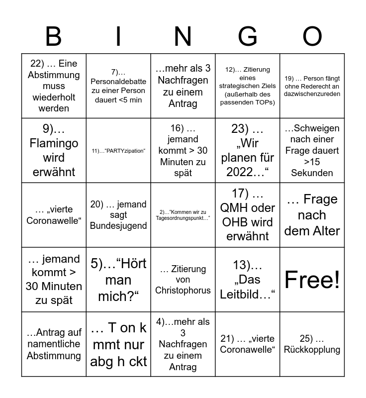 This bingo card has 51 words: )…Schweigen nach einer Frage dauert >15 Sekunden, 2)…“Kommen wir zu Tagesordnungspunkt…“, 3)…Antrag auf namentliche Abstimmung, 4)…mehr als 3 Nachfragen zu einem Antrag, 5)…“Hört man mich?“, 6)…formale Gegenrede, 7)…Personaldebatte zu einer Person dauert <5 min, 8)… Waschbären werden erwähnt, 9)… Flamingo wird erwähnt, 10)… T on k mmt nur abg h ckt, 11)…“PARTYzipation“, 12)… Zitierung eines strategischen Ziels (außerhalb des passenden TOPs), Free!, 13)… „Das Leitbild…“, 14)…“Fäshionlab“, 15) … Frage nach dem Alter, 16) … jemand kommt > 30 Minuten zu spät, 17) … QMH oder OHB wird erwähnt, 18) … jemand vergisst sich nach einem Beitrag wieder zu muten, 19) … Person fängt ohne Rederecht an dazwischenzureden, 20) … jemand sagt Bundesjugend, 21) … „vierte Coronawelle“, 22) … Eine Abstimmung muss wiederholt werden, 23) … „Wir planen für 2022…“, 24) … Zitierung von Christophorus, 25) … Rückkopplung, …Schweigen nach einer Frage dauert >15 Sekunden, …“Kommen wir zu Tagesordnungspunkt…“, …Antrag auf namentliche Abstimmung, …mehr als 3 Nachfragen zu einem Antrag, …“Hört man mich?“, …formale Gegenrede, …Personaldebatte zu einer Person dauert <5 min, … Waschbären werden erwähnt, … Flamingo wird erwähnt, … T on k mmt nur abg h ckt, …“PARTYzipation“, … Zitierung eines strategischen Ziels (außerhalb des passenden TOPs), … „Das Leitbild…“, …“Fäshionlab“, … Frage nach dem Alter, … jemand kommt > 30 Minuten zu spät, … QMH oder OHB wird erwähnt, … jemand vergisst sich nach einem Beitrag wieder zu muten, … Person fängt ohne Rederecht an dazwischenzureden, … jemand sagt Bundesjugend, … „vierte Coronawelle“, … Eine Abstimmung muss wiederholt werden, … „Wir planen für 2022…“, … Zitierung von Christophorus and … Rückkopplung.