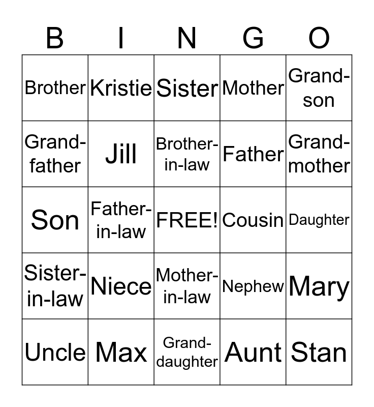 This bingo card has a free space and 24 words: Niece, Max, Brother-in-law, Uncle, Grand-son, Brother, Grand-father, Kristie, Cousin, Mother-in-law, Father, Son, Nephew, Mary, Jill, Aunt, Daughter, Sister, Grand-mother, Father-in-law, Stan, Sister-in-law, Mother and Grand-daughter.