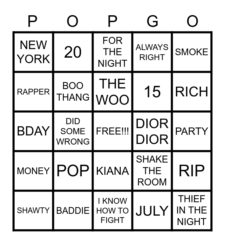 This bingo card has a free space and 24 words: POP, BADDIE, THE WOO, SHAWTY, SMOKE, NEW YORK, RAPPER, 20, DIOR DIOR, KIANA, 15, BDAY, SHAKE THE ROOM, RIP, BOO THANG, JULY, PARTY, FOR THE NIGHT, RICH, DID SOME WRONG, THIEF IN THE NIGHT, MONEY, ALWAYS RIGHT and I KNOW HOW TO FIGHT.