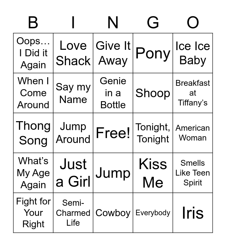 This bingo card has a free space and 24 words: Just a Girl, Semi- Charmed Life, Genie in a Bottle, Fight for Your Right, Ice Ice Baby, Oops… I Did it Again, When I Come Around, Love Shack, Tonight, Tonight, Jump, Shoop, Thong Song, Kiss Me, Smells Like Teen Spirit, Say my Name, Everybody, American Woman, Give It Away, Breakfast at Tiffany’s, Jump Around, Iris, What’s My Age Again, Pony and Cowboy.