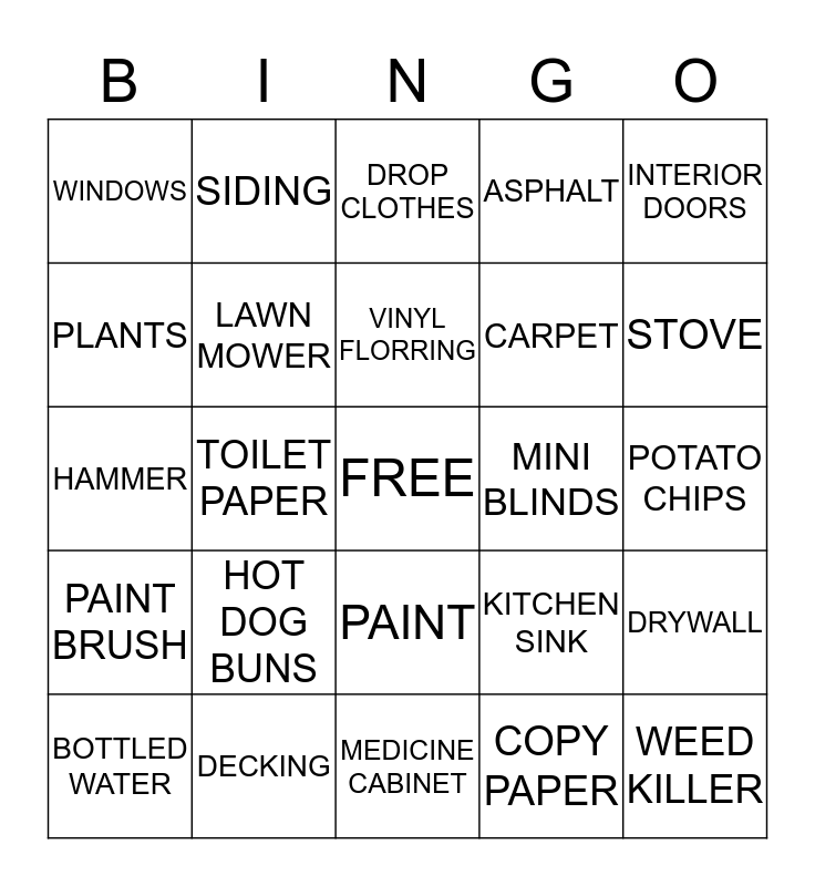 This bingo card has a free space and 24 words: HOT DOG BUNS, DECKING, VINYL FLORRING, BOTTLED WATER, INTERIOR DOORS, WINDOWS, PLANTS, SIDING, MINI BLINDS, PAINT, CARPET, HAMMER, KITCHEN SINK, DRYWALL, LAWN MOWER, COPY PAPER, POTATO CHIPS, DROP CLOTHES, STOVE, TOILET PAPER, WEED KILLER, PAINT BRUSH, ASPHALT and MEDICINE CABINET.