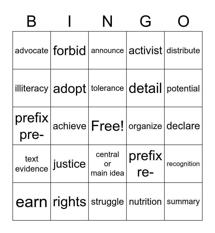 This bingo card has a free space and 24 words: justice, rights, tolerance, earn, distribute, advocate, illiteracy, forbid, organize, central or main idea, detail, prefix pre-, prefix re-, recognition, adopt, nutrition, declare, announce, potential, achieve, summary, text evidence, activist and struggle.