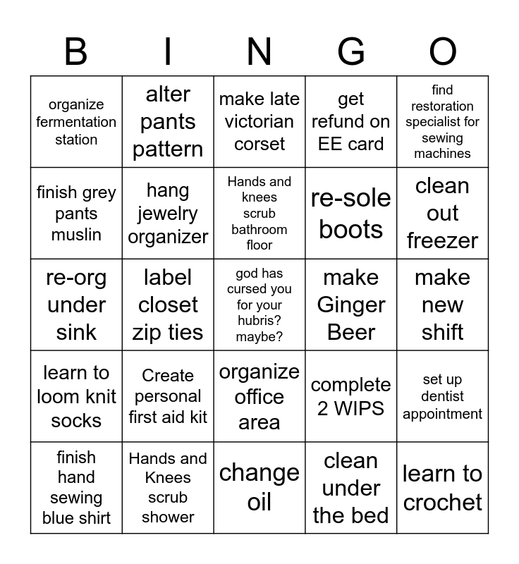 This bingo card has a free space and 24 words: Create personal first aid kit, Hands and Knees scrub shower, Hands and knees scrub bathroom floor, finish hand sewing blue shirt, find restoration specialist for sewing machines, organize fermentation station, finish grey pants muslin, alter pants pattern, make Ginger Beer, organize office area, re-sole boots, re-org under sink, complete 2 WIPS, set up dentist appointment, hang jewelry organizer, clean under the bed, make new shift, make late victorian corset, clean out freezer, label closet zip ties, learn to crochet, learn to loom knit socks, get refund on EE card and change oil.