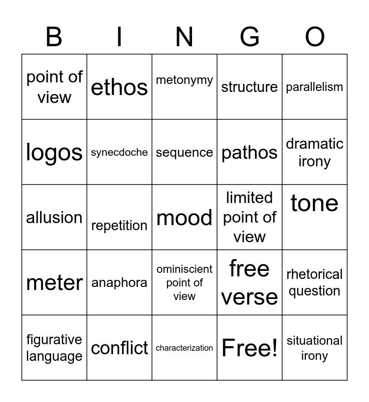 This bingo card has 30 words: conflict, imagery, repetition, connotation, point of view, metonymy, synecdoche, ominiscient point of view, limited point of view, characterization, tone, mood, Free!, situational irony, dramatic irony, blank verse, free verse, meter, anaphora, parallelism, allusion, juxtaposition, ethos, pathos, logos, structure, rhetorical question, figurative language, sequence and denotation.