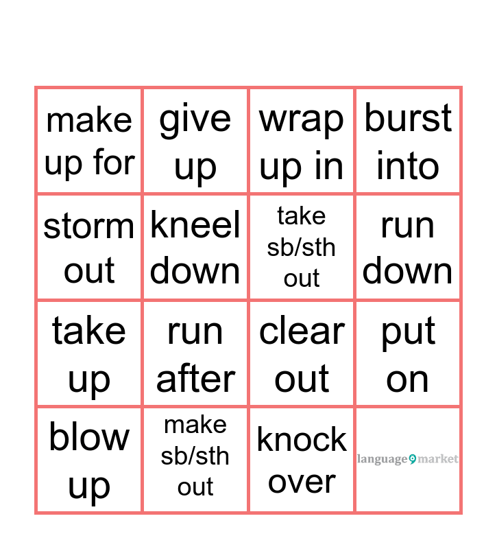 This bingo card has 1 images and 15 words: make sb/sth out, put on, wrap up in, make up for, take up, give up, clear out, knock over, storm out, kneel down, blow up, burst into, run after, run down and take sb/sth out.