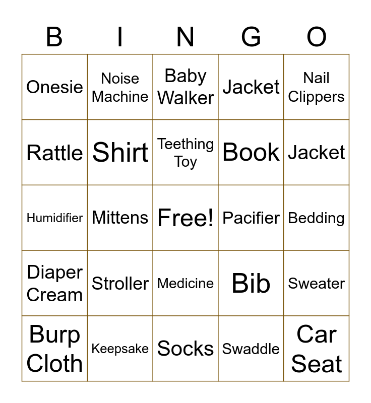 This bingo card has a free space and 48 words: Diaper Bag, Car Seat, Mobile, Socks, Stroller, Baby Monitor, Noise Machine, Crib, Rattle, Blanket, Shirt, Jacket, Sweater, Bib, Bath Tub, Diapers, Teething Toy, Pacifier, Thermometer, Nail Clippers, Mittens, Swaddle, Onesie, Book, Hat, Jacket, Burp Cloth, Baby Shampoo, Medicine, Diaper Cream, Baby Bouncer, Storage, Bath Towel, Pants, Keepsake, Baby Powder, Bassinet, Bedding, Baby Carrier, Rocking Chair, Play Mat, Baby Wipes, Baby Walker, Stuffed Animal, Humidifier, Toy, Baby Decor and Gift Card.