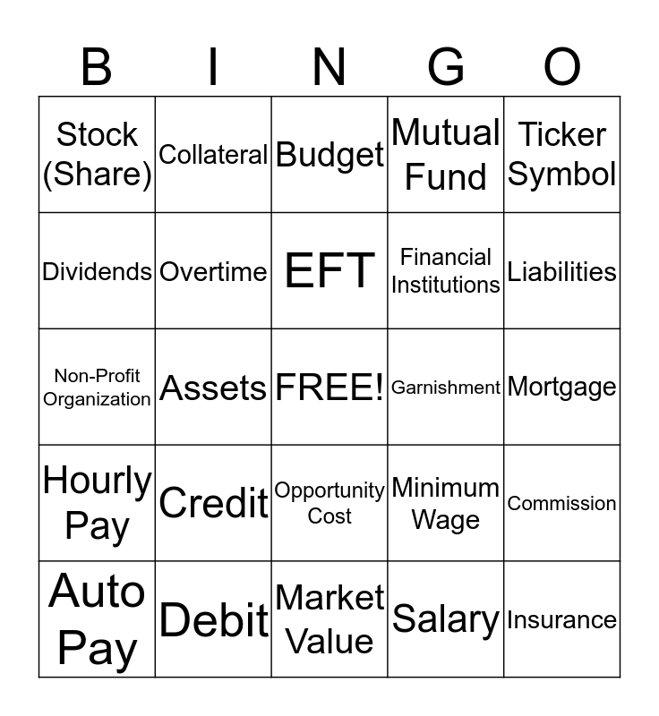 This bingo card has a free space and 24 words: Credit, Debit, EFT, Auto Pay, Ticker Symbol, Stock (Share), Dividends, Collateral, Garnishment, Opportunity Cost, Financial Institutions, Non-Profit Organization, Minimum Wage, Commission, Overtime, Salary, Mortgage, Budget, Liabilities, Assets, Insurance, Hourly Pay, Mutual Fund and Market Value.
