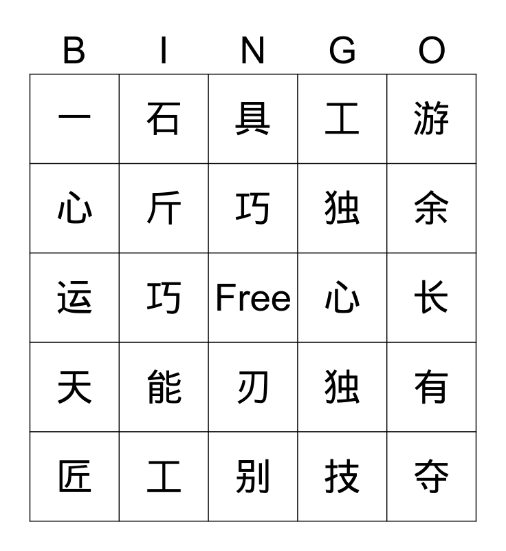 This bingo card has a free space and 24 words: 能, 工, 巧, 匠, 游, 一, 心, 石, 心, 刃, 独, 运, 独, 有, 斤, 技, 长, 具, 余, 巧, 夺, 天, 工 and 别.