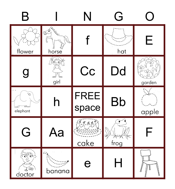 This bingo card has 12 images, a free space and 12 words: Aa, Cc, E, g, Bb, Dd, F, H, f, h, G and e.