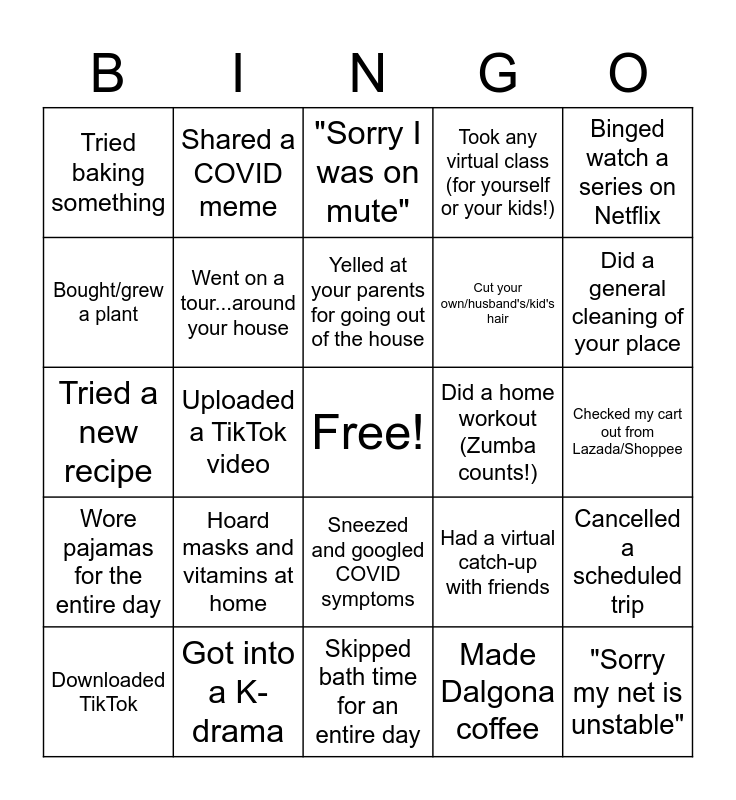 This bingo card has a free space and 26 words: Sneezed and googled COVID symptoms, Made Dalgona coffee, Yelled at your parents for going out of the house, Got into a K-drama, Binged watch a series on Netflix, Tried baking something, Bought/grew a plant, Shared a COVID meme, Checked my cart out from Lazada/Shoppee, Had a virtual catch-up with friends, Cut your own/husband's/kid's hair, Tried a new recipe, Cancelled a scheduled trip, Downloaded TikTok, Uploaded a TikTok video, Thought of being a Youtuber/streamer, Took any virtual class (for yourself or your kids!), Wore pajamas for the entire day, "Sorry I was on mute", "Sorry my net is unstable", Did a general cleaning of your place, Skipped bath time for an entire day, Did a home workout (Zumba counts!), Hoard masks and vitamins at home, Went on a tour...around your house and Checked-in on my relatives.