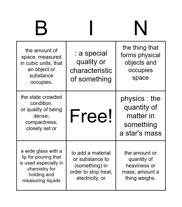 This bingo card has a free space and 8 words: physics : the quantity of matter in something a star's mass, the thing that forms physical objects and occupies space, : a special quality or characteristic of something, a wide glass with a lip for pouring that is used especially in chemistry for holding and measuring liquids, the amount of space, measured in cubic units, that an object or substance occupies., the amount or quantity of heaviness or mass; amount a thing weighs., the state crowded condition. or quality of being dense; compactness; closely set or and to add a material or substance to (something) in order to stop heat, electricity, or.