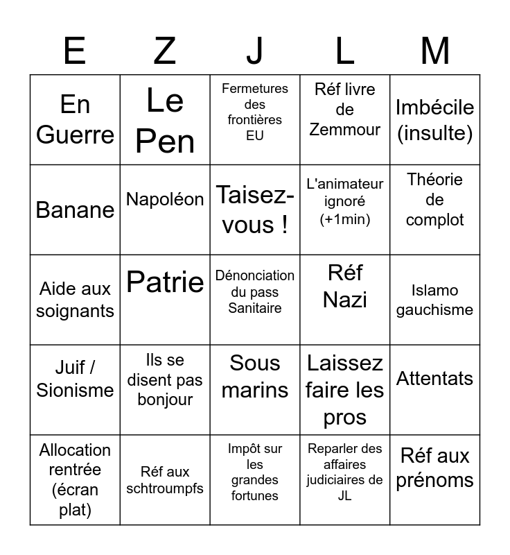 This bingo card has a free space and 24 words: Ils se disent pas bonjour, Réf aux schtroumpfs, Taisez-vous !, Allocation rentrée (écran plat), Imbécile (insulte), En Guerre, Banane, Le Pen, Réf Nazi, Sous marins, L'animateur ignoré (+1min), Aide aux soignants, Laissez faire les pros, Attentats, Napoléon, Reparler des affaires judiciaires de JL, Islamo gauchisme, Fermetures des frontières EU, Théorie de complot, Patrie, Réf aux prénoms, Juif / Sionisme, Réf livre de Zemmour and Impôt sur les grandes fortunes.