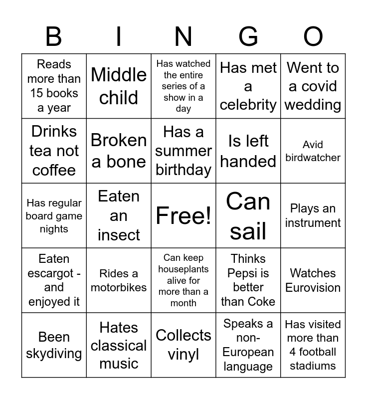 This bingo card has a free space and 29 words: Been skydiving, Has more than 3 pets, Eaten an insect, Loves spicy food, Reads more than 15 books a year, Has watched the entire series of a show in a day, Broken a bone, Rides a motorbikes, Can sail, Hates classical music, Plays an instrument, Has visited more than 4 football stadiums, Collects vinyl, Speaks a non-European language, Avid birdwatcher, Sews clothes, Can keep houseplants alive for more than a month, Eaten escargot - and enjoyed it, Went to a covid wedding, Has regular board game nights, Thinks Pepsi is better than Coke, Plays a club sport, Is left handed, Drinks tea not coffee, Has met a celebrity, Middle child, Watches Eurovision, Has a summer birthday and Stroked a dolphin.