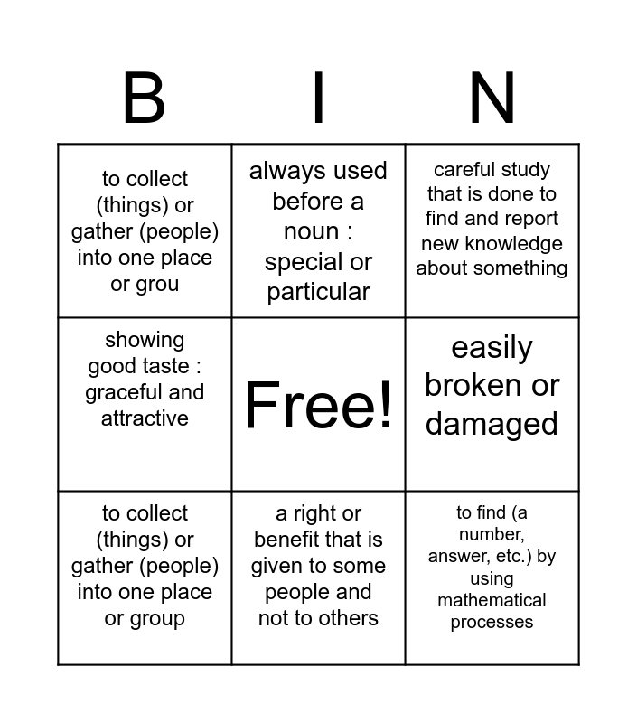 This bingo card has a free space and 8 words: easily broken or damaged, careful study that is done to find and report new knowledge about something, always used before a noun : special or particular, to collect (things) or gather (people) into one place or group, to collect (things) or gather (people) into one place or grou, to find (a number, answer, etc.) by using mathematical processes, showing good taste : graceful and attractive and a right or benefit that is given to some people and not to others.