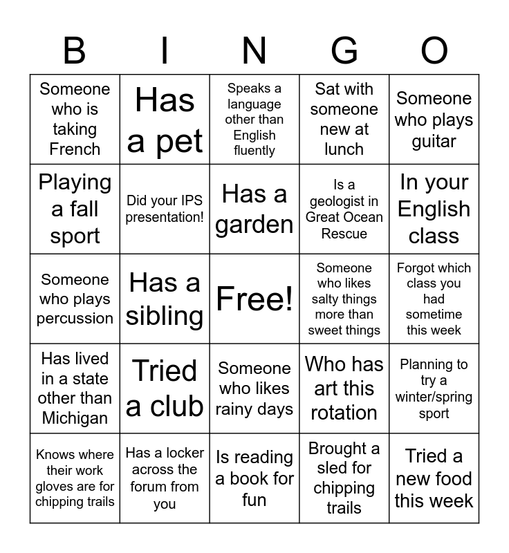 This bingo card has a free space and 24 words: Tried a club, Has a locker across the forum from you, Has a garden, Knows where their work gloves are for chipping trails, Someone who plays guitar, Someone who is taking French, Playing a fall sport, Has a pet, Someone who likes salty things more than sweet things, Someone who likes rainy days, Is a geologist in Great Ocean Rescue, Someone who plays percussion, Who has art this rotation, Planning to try a winter/spring sport, Did your IPS presentation!, Brought a sled for chipping trails, Forgot which class you had sometime this week, Speaks a language other than English fluently, In your English class, Has a sibling, Tried a new food this week, Has lived in a state other than Michigan, Sat with someone new at lunch and Is reading a book for fun.