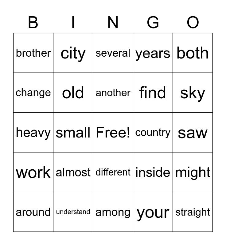This bingo card has a free space and 25 words: almost, among, another, around, both, brother, change, city, country, different, find, heavy, inside, might, old, open, saw, several, sky, small, straight, understand, work, years and your.