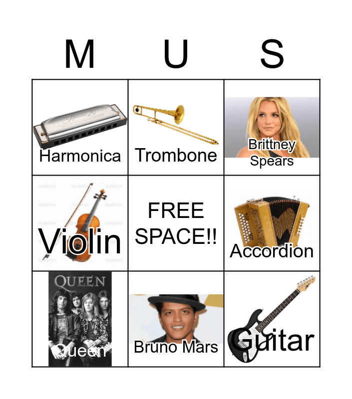 This bingo card has 34 images, a free space and 30 words: French Horn, Tuba, Cello, Trombone, Flute, Harmonica, Ukulele, Accordion, Violin, Recorder, Taylor Swift, Bruno Mars, Eminem, Selena Gomez, Liam Payne, Miley Cyrus, Justin Bieber, Jay-Lo, Brittney Spears, Shawn Mendes, Beatles, Garth Brooks, Queen, Harp, Guitar, Piano, Michael Jackson, Elvis, Drake and Rolling Stones.