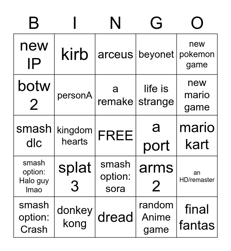 This bingo card has a free space and 24 words: splat 3, donkey kong, a remake, smash option: Crash, new pokemon game, new IP, botw 2, kirb, a port, smash option: sora, life is strange, smash dlc, arms 2, an HD/remaster, personA, random Anime game, mario kart, arceus, new mario game, kingdom hearts, final fantas, smash option: Halo guy lmao, beyonet and dread.