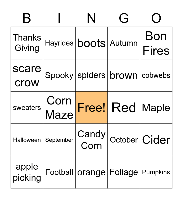 This bingo card has a free space and 24 words: September, Football, spiders, apple picking, Bon Fires, Thanks Giving, scare crow, Hayrides, Red, Candy Corn, brown, sweaters, October, Cider, Spooky, Foliage, Maple, boots, cobwebs, Corn Maze, Pumpkins, Halloween, Autumn and orange.