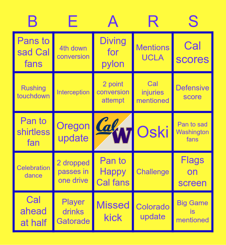 This bingo card has a free space and 47 words: Castor mentions "intangibles", Big Game is mentioned, "X many years under Wilcox", Missed kick, 2 dropped passes in one drive, Husky on Screen, 4th down conversion, Passing touchdown, Rushing touchdown, 2 timeouts in the 1st quarter (same team), Interception, Mentions UCLA, Flags on screen, Challenge, Offsides, False start, 2 point conversion attempt, Oski, Cal wins, Cal scores, Oregon update, Colorado update, Pans to sad Cal fans, Cal injuries mentioned, Cal gets 2 first downs in 2 plays, Defensive score, Cal ahead at half, Interception, Pan to Happy Cal fans, Celebration dance, Pan to Cal Spirit, Baby in Cal gear, Wilcox looking like a snack, Replay, Cal gets a sack, Player drinks Gatorade, Pan to sad Washington fans, 35 yard field goal, 20 yard rush, Fumble, 2 punt drives in a row, Diving for pylon, Pan to shirtless fan, Delay of game, Holding, Huddle and PAC 12 standings.