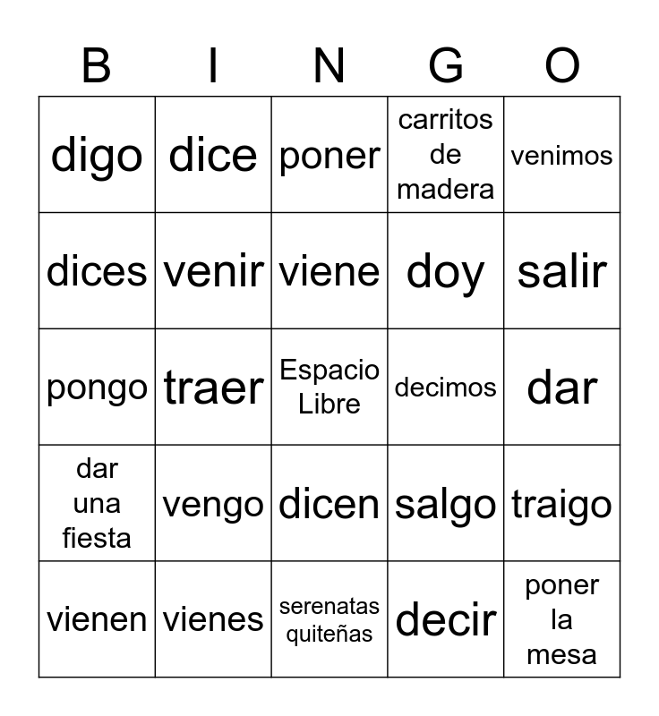 This bingo card has a free space and 24 words: vengo, vienes, viene, vienen, venimos, digo, dices, dice, decimos, dicen, doy, pongo, salgo, traigo, venir, decir, dar, poner, salir, traer, poner la mesa, dar una fiesta, carritos de madera and serenatas quiteñas.