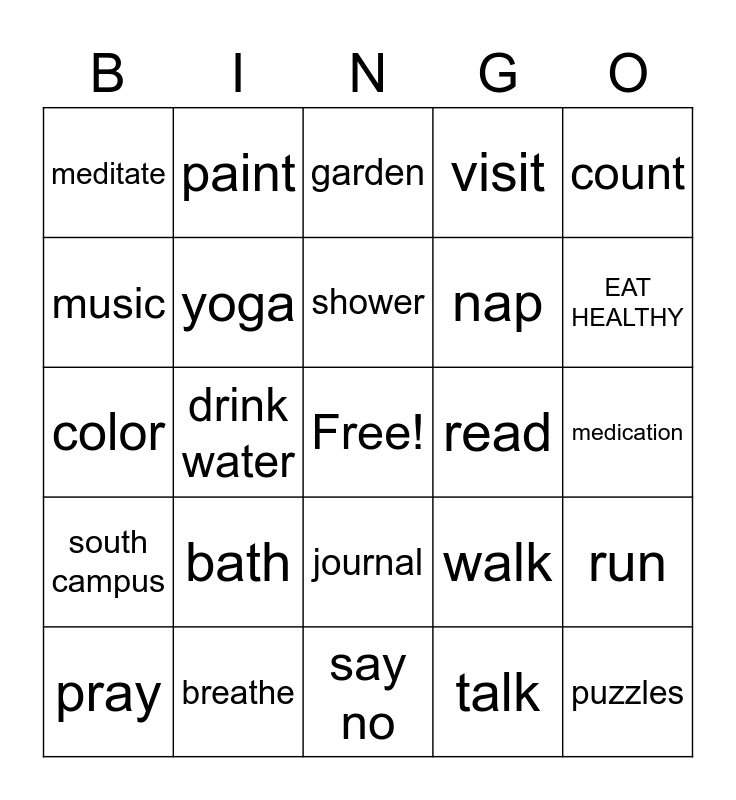 This bingo card has a free space and 24 words: bath, breathe, shower, pray, count, meditate, music, paint, read, journal, nap, color, walk, run, yoga, talk, medication, garden, EAT HEALTHY, drink water, puzzles, south campus, visit and say no.