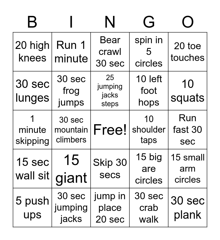 This bingo card has a free space and 24 words: 15 giant, 30 sec jumping jacks, 25 jumping jacks steps, 5 push ups, 20 toe touches, 20 high knees, 30 sec lunges, Run 1 minute, 10 shoulder taps, Skip 30 secs, 10 left foot hops, 1 minute skipping, 15 big are circles, 15 small arm circles, 30 sec frog jumps, 30 sec crab walk, Run fast 30 sec, Bear crawl 30 sec, 10 squats, 30 sec mountain climbers, 30 sec plank, 15 sec wall sit, spin in 5 circles and jump in place 20 sec.