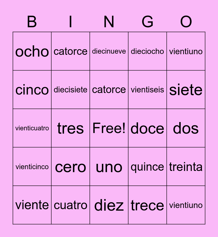 This bingo card has a free space and 24 words: cero, cuatro, catorce, viente, vientiuno, ocho, cinco, catorce, doce, uno, vientiseis, vienticuatro, quince, treinta, diecisiete, trece, dos, diecinueve, siete, tres, vientiuno, vienticinco, dieciocho and diez.