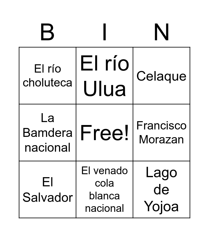 This bingo card has a free space and 8 words: Francisco Morazan, Celaque, El río Ulua, El Salvador, El río choluteca, Lago de Yojoa, La Bamdera nacional and El venado cola blanca nacional.