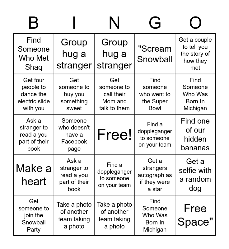 This bingo card has a free space and 38 words: Tie your shoe laces to a stranger and walk 25 yards with them, Get someone to sing a song about your current city, state, Get someone to let you try on their shirt, Get someone to buy you something sweet, Get a selfie with a random dog, Ask a stranger to read a you part of their book, Get someone to call their Mom and talk to them, Find someone who thinks the Earth is flat, Get a couple to tell you the story of how they met, Find someone who went to the Super Bowl, Someone who doesn't have a Facebook page, "Scream Snowball, Free Space", Find one of our hidden bananas, Get four people to dance the electric slide with you, Make a heart, Get a strangers autograph as if they were a star, Group hug a stranger, Find someone named Steve Bob or Mary, Find a doppleganger to someone on your team, Find Someone Who Met Shaq, Take a photo of another team taking a photo, Find Someone Who Was Born In Michigan, Get someone to join the Snowball Party, Find your reflection in an unexpected place, Take a photo of another team taking a photo, Get someone to join the Snowball Party, Get a couple to tell you the story of how they met, Make a heart, Find someone who went to the Super Bowl, Tie your shoe laces to a stranger and walk 25 yards with them, Find a doppleganger to someone on your team, Find Someone Who Was Born In Michigan, Group hug a stranger, Find one of our hidden bananas, Get a strangers autograph as if they were a star, Ask a stranger to read a you part of their book and Get a selfie with a random dog.
