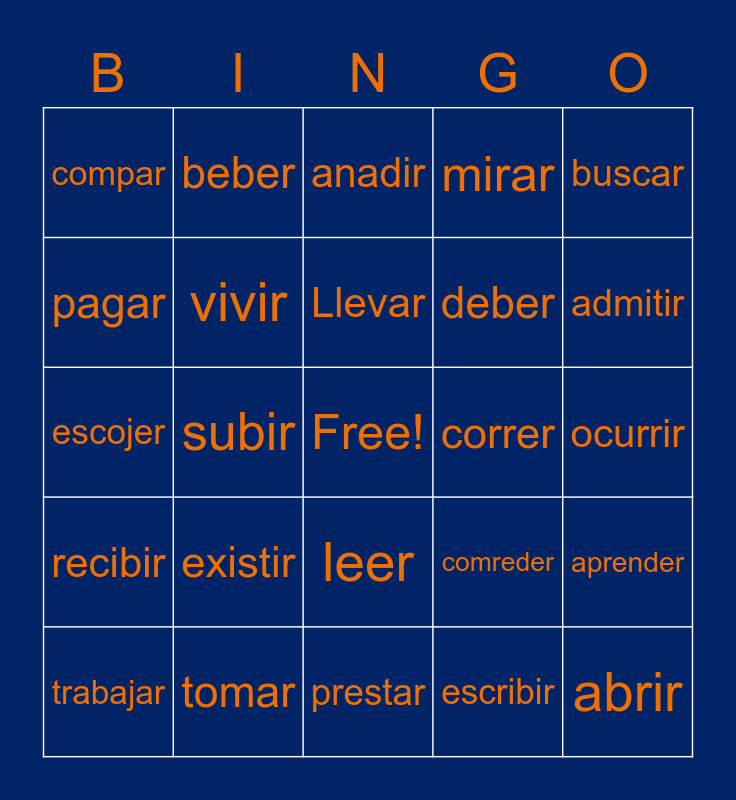 This bingo card has a free space and 24 words: existir, tomar, Llevar, trabajar, buscar, compar, pagar, beber, correr, leer, deber, escojer, comreder, aprender, vivir, escribir, ocurrir, anadir, admitir, subir, abrir, recibir, mirar and prestar.