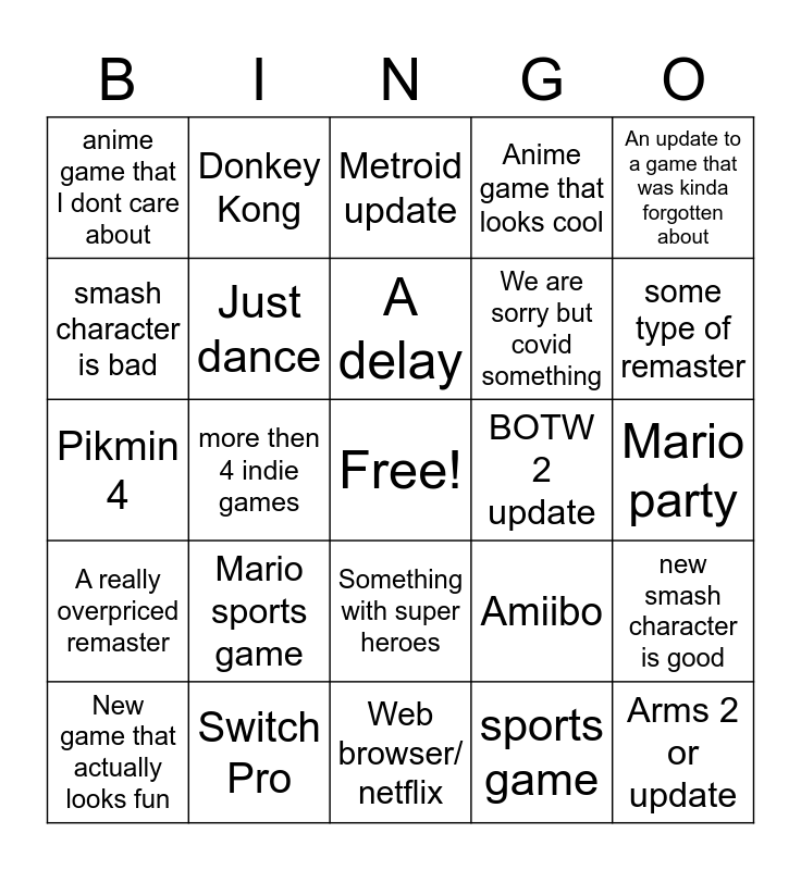 This bingo card has a free space and 24 words: Mario sports game, Switch Pro, A delay, New game that actually looks fun, An update to a game that was kinda forgotten about, anime game that I dont care about, smash character is bad, Donkey Kong, BOTW 2 update, Something with super heroes, We are sorry but covid something, Pikmin 4, Amiibo, new smash character is good, Just dance, sports game, Mario party, Metroid update, some type of remaster, more then 4 indie games, Arms 2 or update, A really overpriced remaster, Anime game that looks cool and Web browser/ netflix.