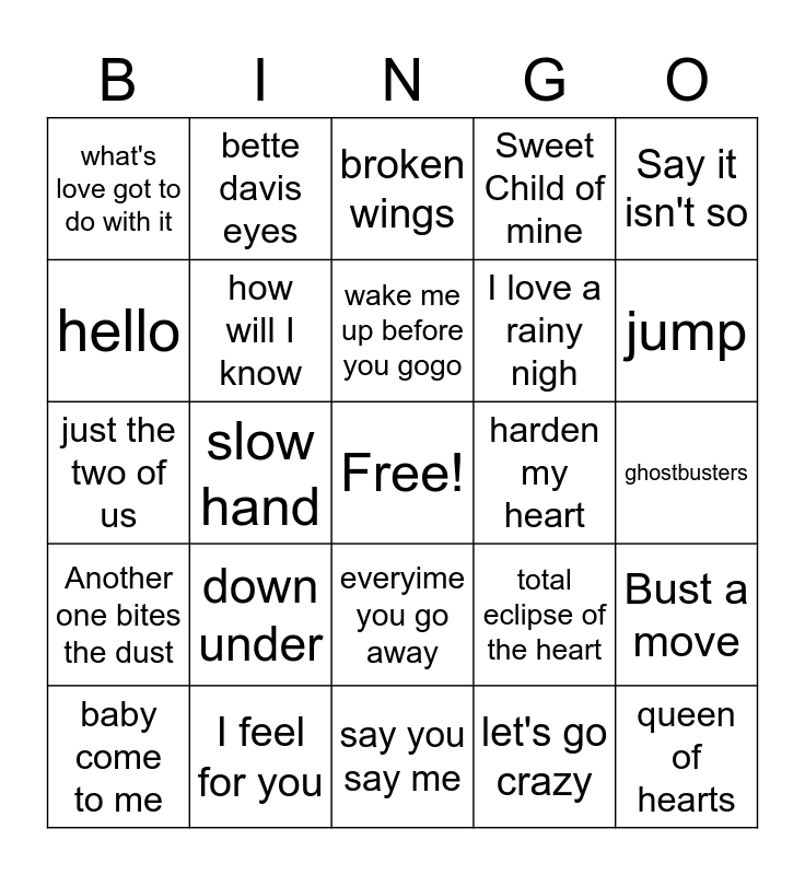 This bingo card has a free space and 129 words: Physical, bette davis eyes, endless love, eye of the tiger, every breath you take, Flashdance, Another one bites the dust, say say say, call me, lady, centerfold, just like starting over, that’s what friends are for, upside down, abracadabra, billie jean, say you say me, all night long, Jessie's girl, celebration, kiss on my list, I love a rainy nigh, 9 to 5, keep on loving you, morning train, being with you, queen of hearts, rapture, a woman needs love (just like you do), the tide is high, just the two of us, slow hand, woman, I love rock and roll, ebony and ivory, don't you want me, jack and diane, hurts so good, hard to say im sorry, tainted love, harden my heart, rosanna, I can't go for that, 867-5309, Key largo, you should hear how she talks about you, don't talk to strangers, down under, beat it, total eclipse of the heart, maneater, baby come to me, maniac, sweet dreams, do you really want to hurt me, you and I, come on eileen, shame on the moon, she works hard for the money, hungry like the wolf, never gonna let you go, let's dance, twilight zone, I know theres something going on, when doves cry, what's love got to do with it, footloose, against all odds, jump, hello, owner of a loney heart, ghostbusters, karma chameleon, missing you, dancine in the dark, Girls Just want to have fun, the reflex, time after time, jump for my love, talking in your sleep, let's go crazy, Say it isn't so, careless whisper, like a virgin, wake me up before you gogo, I want to know what love is, I feel for you, out of touch, everybody wants to rule the world, money for nothing, crazy for you, take on me, everyime you go away, easy lover, can't fight this feeling, we built this city, shout, broken wings, how will I know, party all the time, Living on a prayer, Sweet Child of mine, My Prerogative, Every Rose has a thorn, Wild Thing, Bust a move, Relax, Summer of '69, Don’t you forget about me, Rio, True Colors, Walk this way, Walking on Sunshine, Uptown girls, You give love a bad name, My Sharona, La Bamba, Janie's got a gun, Roxanne, Like a prayer, sledgehammer, West End Girls, Pump up the Jam, It's still rock and roll to me, Love Shack, Simply Irresistible, Everybody have fun tonight, Rapper's Delight and Push it.