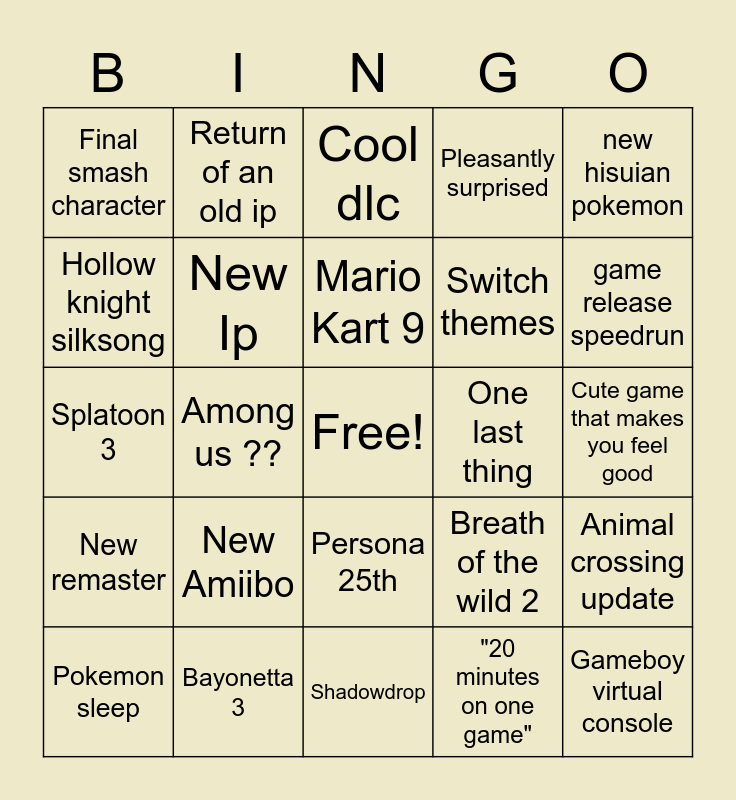 This bingo card has a free space and 24 words: New Amiibo, Bayonetta 3, Mario Kart 9, Pokemon sleep, new hisuian pokemon, Final smash character, Hollow knight silksong, Return of an old ip, One last thing, Persona 25th, Switch themes, Splatoon 3, Breath of the wild 2, Animal crossing update, New Ip, "20 minutes on one game", Cute game that makes you feel good, Cool dlc, game release speedrun, Among us ??, Gameboy virtual console, New remaster, Pleasantly surprised and Shadowdrop.
