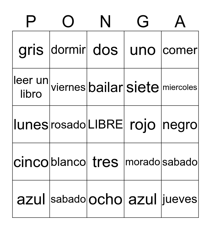 This bingo card has a free space and 24 words: blanco, sabado, bailar, azul, comer, gris, leer un libro, dormir, rojo, tres, siete, lunes, morado, sabado, viernes, azul, negro, dos, miercoles, rosado, jueves, cinco, uno and ocho.