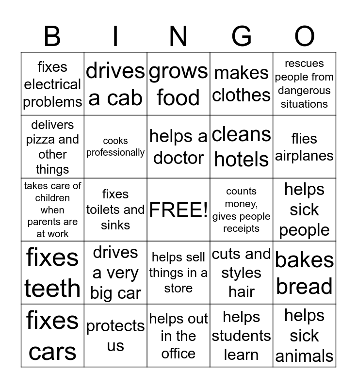 This bingo card has a free space and 24 words: drives a very big car, protects us, helps a doctor, fixes cars, rescues people from dangerous situations, fixes electrical problems, delivers pizza and other things, drives a cab, counts money, gives people receipts, helps sell things in a store, cleans hotels, takes care of children when parents are at work, cuts and styles hair, bakes bread, cooks professionally, helps students learn, helps sick people, grows food, flies airplanes, fixes toilets and sinks, helps sick animals, fixes teeth, makes clothes and helps out in the office.