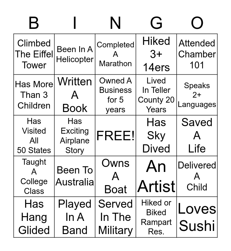 This bingo card has a free space and 24 words: Been To Australia, Played In A Band, Owned A Business for 5 years, Has Hang Glided, Attended Chamber 101, Climbed The Eiffel Tower, Has More Than 3 Children, Been In A Helicopter, Has Sky Dived, Owns A Boat, Lived In Teller County 20 Years, Has Visited All 50 States, An Artist, Delivered A Child, Written A Book, Hiked or Biked Rampart Res., Saved A Life, Completed A Marathon, Speaks 2+ Languages, Has Exciting Airplane Story, Loves Sushi, Taught A College Class, Hiked 3+ 14ers and Served In The Military.
