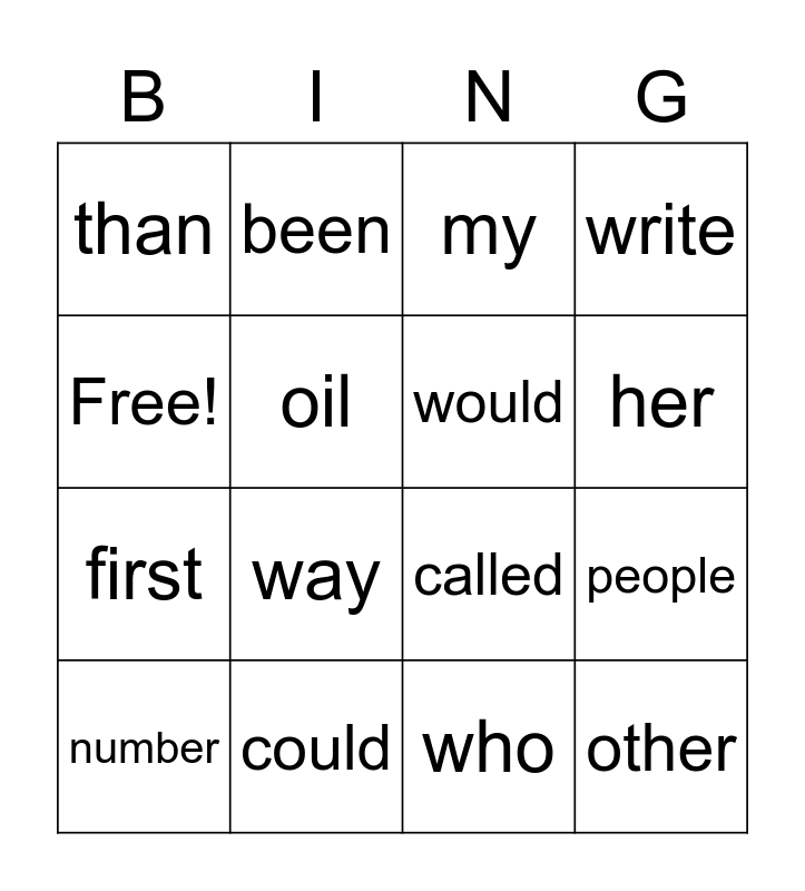 This bingo card has 16 words: could, people, my, than, first, been, called, who, Free!, oil, number, write, way, her, would and other.