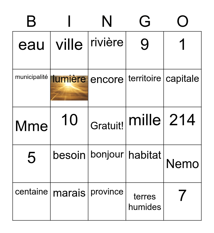 This bingo card has 1 images, a free space and 39 words: chaleur, unité, dizaine, lumière, centaine, bonjour, encore, 2, 1, 5, 10, 9, 7, 214, mille, besoin, espace, eau, air, habitat, municipalité, province, territoire, capitale, Canada, maritimes, prairies, océans, désert, ville, forêt, toundra, rivière, marais, terres humides, autre, Nemo, Mme and M.