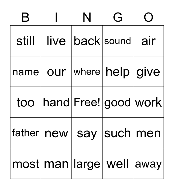This bingo card has a free space and 24 words: new, man, where, most, air, still, name, live, good, say, help, too, such, men, our, well, work, back, give, hand, away, father, sound and large.