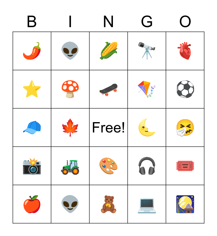 This bingo card has a free space and 29 words: ๐, ๐, ๐, ๐ฒ, ๐ถ๏ธ, ๐ฝ, ๐, ๐, ๐, ๐ฝ, ๐คง, ๐, ๐งธ, ๐ป, โฝ, ๐, ๐จ, ๐ธ, ๐ซ, ๐งข, ๐ง, ๐ช, ๐ช, โญ, ๐ญ, ๐ฝ, ๐๏ธ, ๐น and ๐ก.