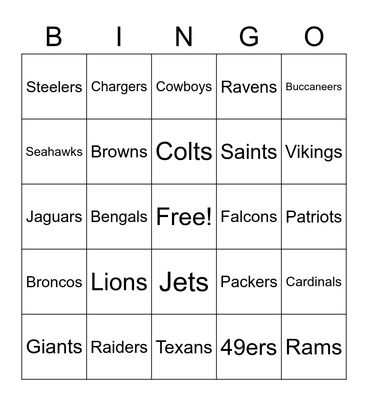 This bingo card has a free space and 32 words: 49ers, Bears, Bengals, Bills, Broncos, Browns, Buccaneers, Cardinals, Chargers, Chiefs, Colts, Cowboys, Dolphins, Eagles, Falcons, Football Team, Giants, Jaguars, Jets, Lions, Packers, Panthers, Patriots, Raiders, Rams, Ravens, Saints, Seahawks, Steelers, Texans, Titans and Vikings.